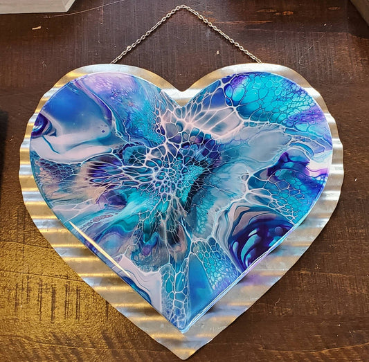 Blue Heart Abstract Art Acrylic Pour on Metal Backing 10" wide