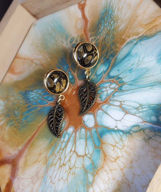 Gold, Black and Bronze Fluid Art and Leaf Stud Drop Earrings