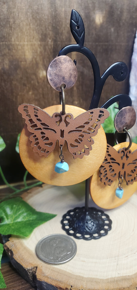 Leather Butterfly Dangle Post Earrings with Wood and Turquoise