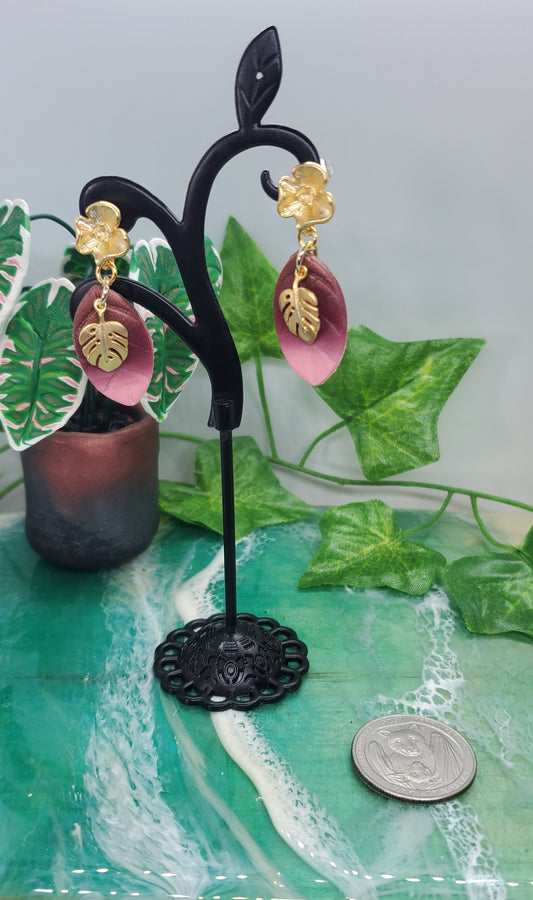 Monstera Dangle Earrings with Pink and Mauve Ombre Leaf in Matte 14K Gold Plated Sterling Silver