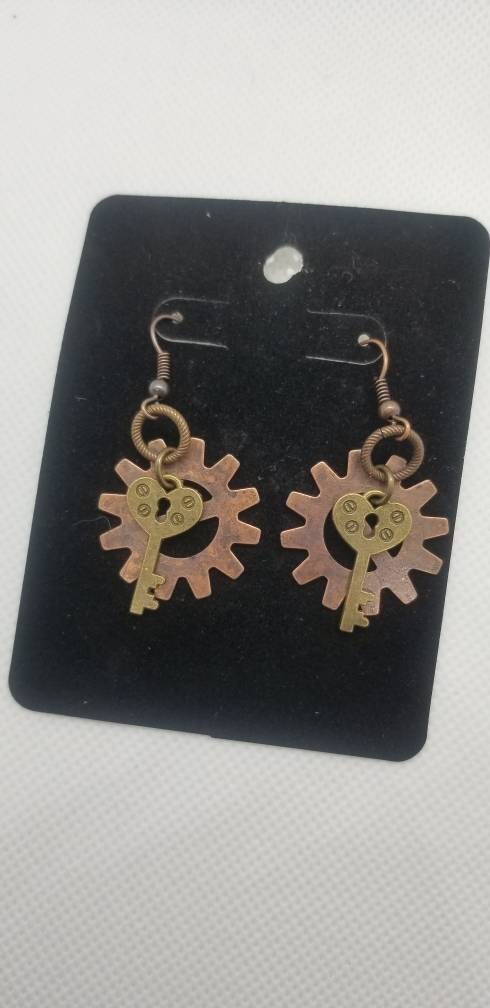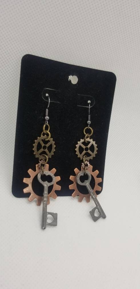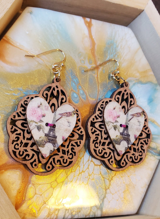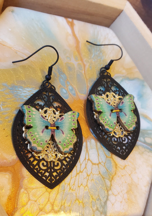 Green Butterfly Wood Button with Gold and Black Filigree Earrings