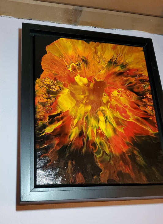 Inferno - An Abstract Fluid Art Painting in Red, Orange, Yellow, and Black with a Copper Center. 11x14, Framed